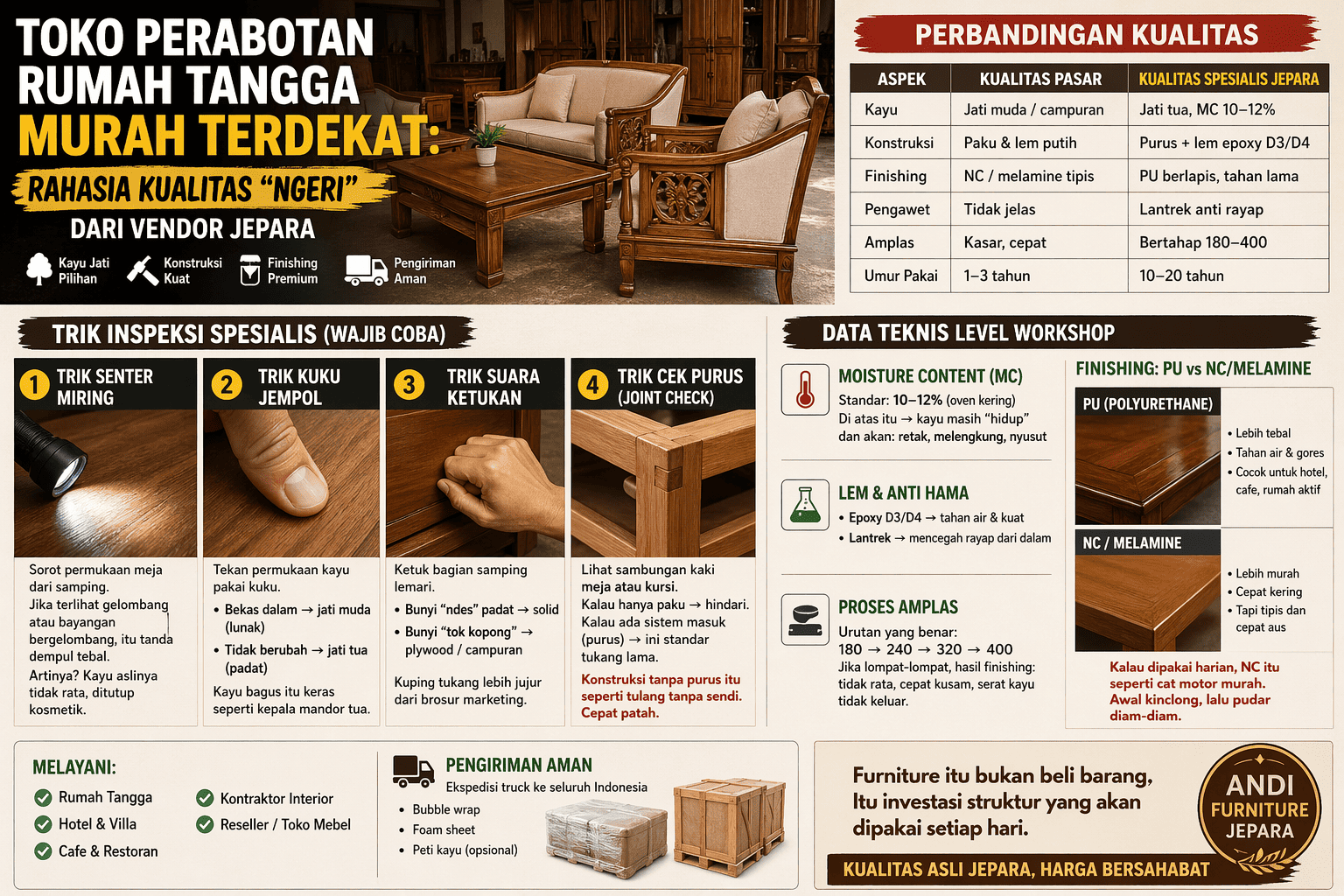 Mencari toko peralatan rumah tangga terdekat untuk furniture tidak cukup melihat jarak. Standar teknis yang wajib: kayu jati dengan Moisture Content (MC) 10–12% hasil oven, konstruksi sambungan purus + lem epoxy D3/D4, serta perlindungan anti hama Lantrek. Finishing terbaik menggunakan PU (Polyurethane) berlapis, bukan sekadar NC/melamine. Permukaan harus melalui amplas bertahap grid 180, 240, 320 hingga 400 agar padat, rata, dan tahan lama.
